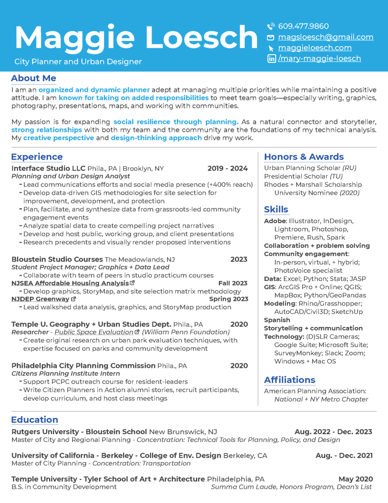 I recently completed my Master of City + Regional Planning degree at Rutgers University’s Bloustein School of Planning and Public Policy, with a concentration in Technical Tools. My interdisciplinary work aims to improve communities’ quality of life and build connections.