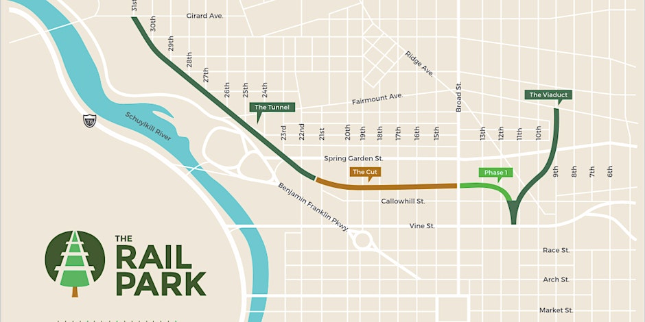 The quarter-mile stretch of park once joined the train line from the west side of the city with the Reading Railroad. Beginning at Broad and Noble Street, the viaduct curves southwest to Vine and 11th Street. It was purchased by SEPTA after the last train ran on it in 1992, and was sold to Friends of the Rail Park a few years ago.