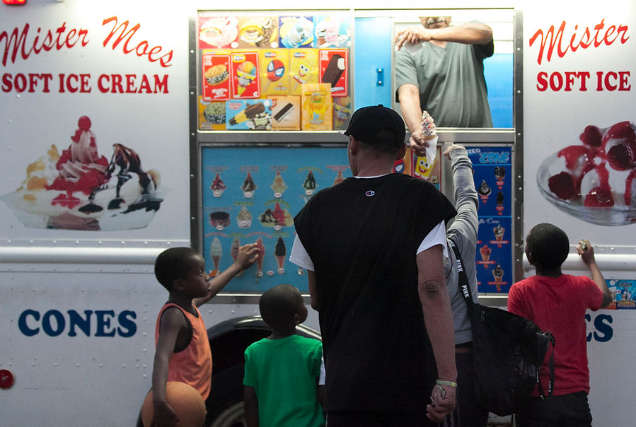 Golden light washed over the crowded pool, a tight ship run by “Ms. Joanne,” as Dendy Playground pool maintenance associate Joanne Williams-Campbell is known. (She has strict rules: no towels or shoes on the pool deck; all swimmers must shower before and after going into the water.) The water ice truck parked at the curb blared Christmas tunes while the line of antsy kids only got longer.