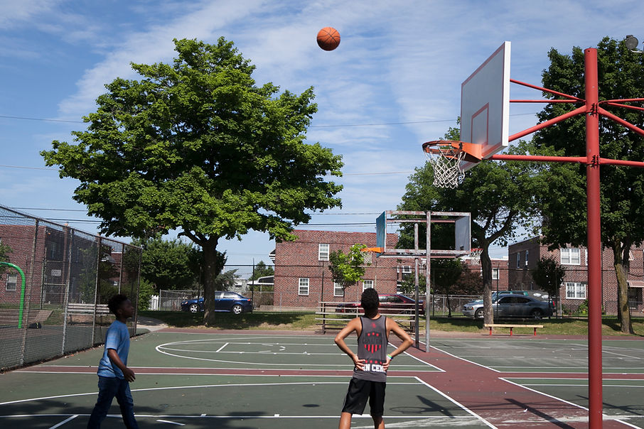 Kids on bikes popped wheelies as they criss-crossed the basketball courts during breaks in summer-league contests. Conversations, children’s games, and SEPTA trains roaring past overhead joined birdsong in the air. The bright blue sky slowly turned orange, then faded to navy.