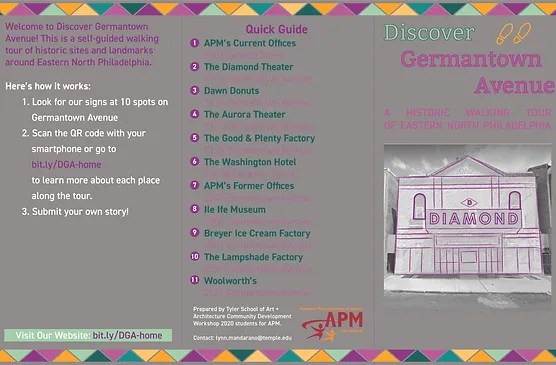 Discover Germantown Avenue, later re-named Eastern North Walking Tours, is a historic walking tour set developed by the Tyler School of Art and Architecture’s Community Development Class of 2020 for our capstone project. Our work built off of the 2019 class’s work with local non-profit APM, which was a community history visioning event called Remembering and Envisioning Germantown Avenue. We expanded on their historical research to create a historic walking tour, complete with a brochure, website, recorded first-hand resident memories, and signs marking each site.